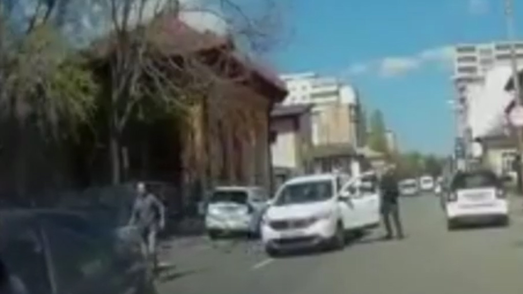 Incidentul s-a petrecut pe o strada din sectorul 2 al Capitalei, dupa ce unul dintre soferi i-a taiat celuilalt calea. Din masina coboara doi barbati, iar unul dintre ei arunca un topor spre cealalta masina.
