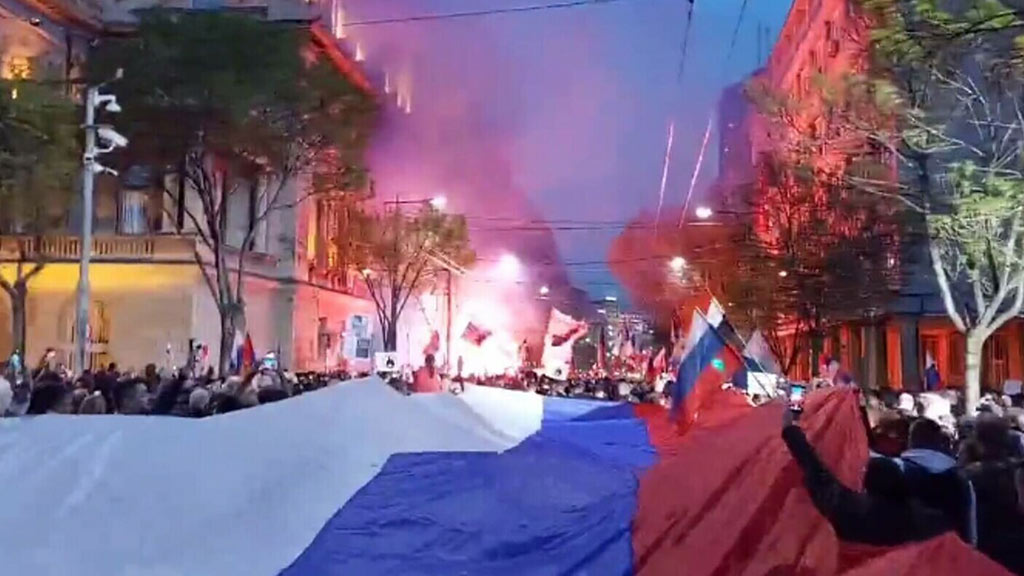 Multimea de oameni, multi din organizatii ultranationaliste, s-au alaturat marsului din centrul orasului pana la ambasada rusa din apropiere, unde au tras semnale de rachete, au cantat imnuri rusesti si sarbesti si au salutat cele doua tari ca natiuni infratite.