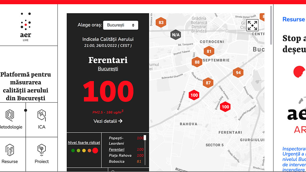 „Senzorii din reteaua Aerlive inregistreaza valori foarte mari in seara aceasta, 26 ianuarie, in special in zonele periferice ale Bucurestiului: Popesti-Leordeni, Giulesti Sarbi, Chiajna, Ferentari. Am primit si sesizari de la cetateni, care reclama arderi de deseuri. In acelasi timp, daca ne uitam pe calitateaer.ro, la reteaua nationala, observam cum statiile din vest, B9, 10 si 11 nu functioneaza si nu masoara exact acolo unde ar trebui. Valorile sunt foarte mari, de peste 100 micrograme/metru cub pentru particulele in suspensie, PM2,5.”, se arata pe pagina de Facebook a retelei independente de monitorizare a calitatii aerului aerlive.