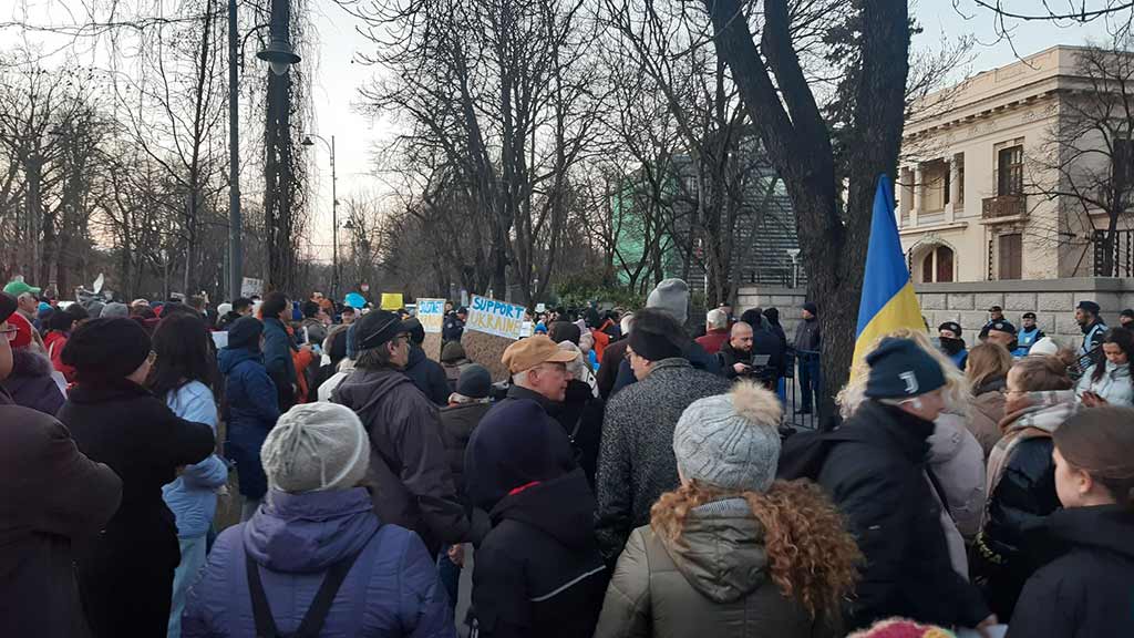 Circa 300 de persoane au protestat sambata dupa amiaza in fata Ambasadei Rusiei de la Bucuresti, dupa ce in Piata Victoriei se stransesera nu mai mult de 400-500 de persoane la o manifestare pro-Ucraina, organizata de Greenpeace Romania alaturi de alte 11 organizatii civice.